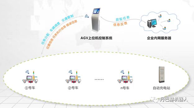 控制计算机根据ERP/MES/WMS请求信号将任务指令下达到AGV车体,实现自动化配送要求。